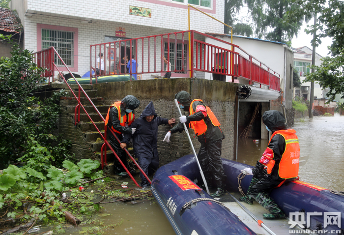 圖為:2020年7月7日,在湖北省黃岡市團(tuán)風(fēng)縣團(tuán)風(fēng)鎮(zhèn)十里湖村,消防員正在轉(zhuǎn)移被困群眾。(央廣網(wǎng)發(fā) 通訊員王方 攝)