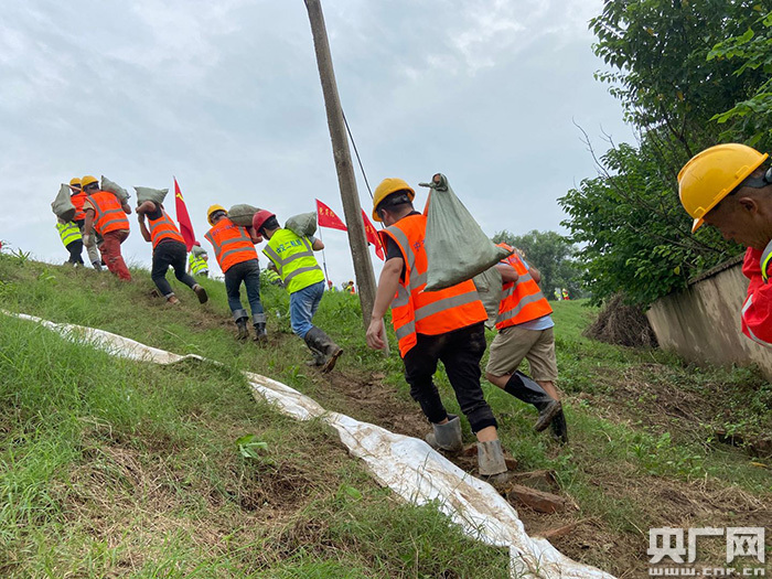 “江水已經(jīng)漫過堤壩,干堤下方涵洞漏水嚴(yán)重!”同日上午9時10分,中交二航局黃石富池碼頭項(xiàng)目應(yīng)急救援隊(duì)隊(duì)員在巡堤的過程中發(fā)現(xiàn)緊急情況,隨即上報當(dāng)?shù)氐谭婪姥粗笓]部。項(xiàng)目部立即組織20余人,用事先準(zhǔn)備的沙袋堵塞堤內(nèi)洞口,同時調(diào)集挖機(jī)1臺、裝載機(jī)1輛,協(xié)同地方政府進(jìn)行搶險堵漏。