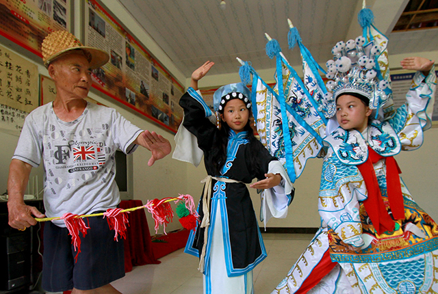7月16日,花垣縣邊城鎮(zhèn)長(zhǎng)老墳村漢劇傳習(xí)所,孩子們?cè)跅顒傧壤先说闹笇?dǎo)下學(xué)習(xí)漢劇。該村在2016年成立“邊城漢劇傳習(xí)所”,由漢劇“非遺”傳承人楊勝先老人義務(wù)執(zhí)教,讓更多的年輕人學(xué)習(xí)、傳承漢劇。龍恩澤 攝