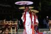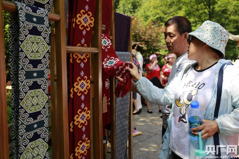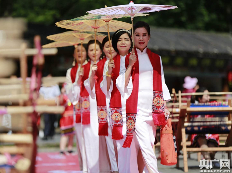 當?shù)仄炫蹛酆谜哌現(xiàn)場走秀,展示了土家族織錦提包、圍巾等旅游產(chǎn)品。 -