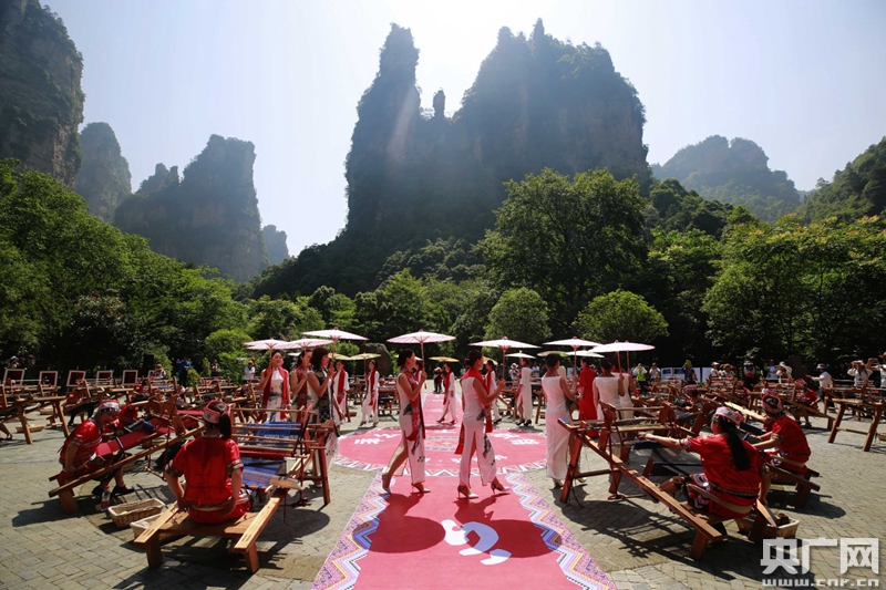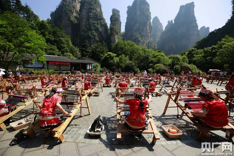 央廣網(wǎng)張家界6月8日消息(記者傅蕾 通訊員吳勇兵)在2018年“文化和自然遺產(chǎn)日”到來之際,6月7日,世界自然遺產(chǎn)地湖南張家界市在武陵源核心景區(qū)世界地質(zhì)公園博物館廣場舉辦土家族織錦進景區(qū)非遺展演展示活動,近百名土家族織錦織女在峰林的見證下現(xiàn)場向中外游客展示張家界省級非物質(zhì)文化遺產(chǎn)土家族織錦技藝。 -