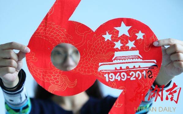 9月27日,大學(xué)生展示創(chuàng)作的慶國慶剪紙作品。近日,南華大學(xué)舉辦“剪紙迎國慶”主題活動,邀請剪紙藝人來校指導(dǎo)大學(xué)生剪紙藝術(shù)愛好者創(chuàng)作,迎接中華人民共和國成立69周年。 肖與軒 曹正平攝影報道