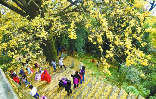 上圖:11月25日,長沙市岳麓山風景區(qū)云麓宮,游客在古銀杏樹邊賞景拍照。近日,這株樹齡700多年的古銀杏進入了一年中最佳的觀賞期,樹上樹下一片金黃,成了攝影師們“打卡”的網(wǎng)紅樹,也吸引了不少游客慕名前來觀賞。湖南日報記者 田超 攝