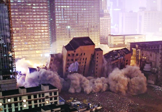 如何讓爆破更安全?施工方采取“微量裝藥”方式,將432公斤炸藥、7300枚雷管埋在4個“爆區(qū)”,分12次引爆,成功將單位時間的震動減小為1/12;采用“分段引爆”方法,“先中間,后兩側(cè)”,并在相鄰建筑物前填充砂石緩沖,盡量降低爆破對周邊的影響。與此同時,項目方還用舊地毯和高強度鋼絲網(wǎng),對裝藥爆破的梁柱多層交替包裹,減少飛石形成,并在玻璃幕墻前方懸掛多層建筑安全網(wǎng)進行被動防護,確保萬無一失。