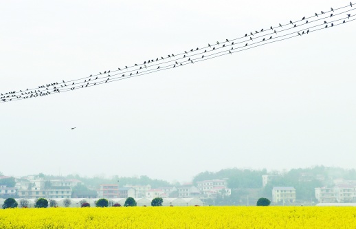 3月19日,漣源市橋頭河鎮(zhèn)珠璜村,許多小鳥在電線上休憩,似一串串跳動(dòng)的音符。隨著氣溫回升,大地春花綻放,群鳥曼舞,處處呈現(xiàn)一片生機(jī)勃勃的景象。