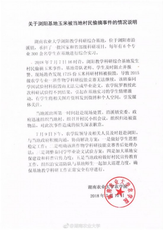 2018年7月7日16時(shí)許,瀏陽(yáng)教學(xué)科研綜合基地發(fā)生村民偷摘玉米事件,基地帶隊(duì)老師、學(xué)生及時(shí)阻止并報(bào)警。現(xiàn)場(chǎng)勘查發(fā)現(xiàn)1725份玉米科研材料被損毀,導(dǎo)致2015級(jí)農(nóng)學(xué)專業(yè)一班作物學(xué)科研技能競(jìng)賽無(wú)法繼續(xù),該班秦同學(xué)因試驗(yàn)材料損毀而無(wú)法完成畢業(yè)論文,農(nóng)學(xué)院羅教授此次科研試驗(yàn)得不到結(jié)果,引起在基地實(shí)習(xí)的學(xué)生情緒激動(dòng),有學(xué)生將相關(guān)圖片資料發(fā)到微博和個(gè)人空間,引發(fā)媒體關(guān)注。