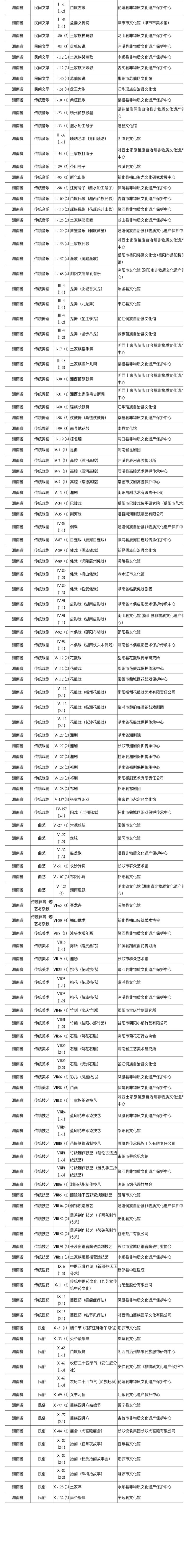 2019年4月文化和旅游部印發(fā)《文化和旅游部辦公廳關(guān)于開展國家級非物質(zhì)文化遺產(chǎn)代表性項(xiàng)目保護(hù)單位檢查和調(diào)整工作的通知》(辦非遺發(fā)〔2019〕66號),組織開展了國家級非物質(zhì)文化遺產(chǎn)代表性項(xiàng)目保護(hù)單位檢查和調(diào)整工作。根據(jù)檢查情況,經(jīng)各地申報(bào),文化和旅游部同意對793個涉及更名、撤銷、職能調(diào)整的保護(hù)單位進(jìn)行調(diào)整和重新認(rèn)定、對14個檢查不合格的保護(hù)單位給予限期整改、對38個檢查不合格的保護(hù)單位取消其保護(hù)單位資格。根據(jù)調(diào)整后的名單,湖南共118個保護(hù)單位上榜。