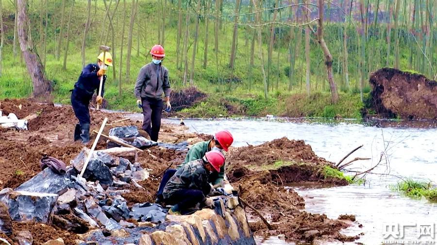工人們在延溪河三陽港鎮(zhèn)河段開展河岸整治(央廣網(wǎng)發(fā) 通訊員供圖)