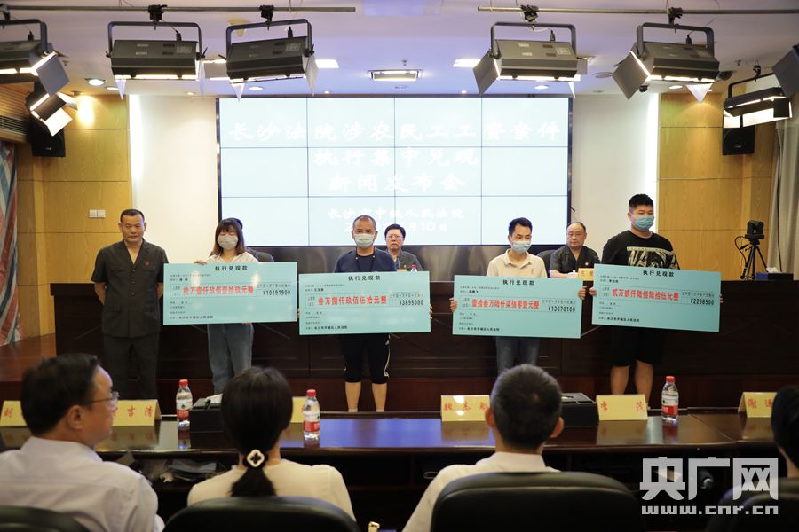長沙市中級人民法院院長肖新平及各基層法院執(zhí)行局局長為32名申請人現(xiàn)場兌現(xiàn)執(zhí)行款,共集中兌現(xiàn)2410.82萬元。肖新平表示,開展農(nóng)民工工資集中兌現(xiàn),是對2020年5月1日起施行的《保障農(nóng)民工工資支付條例》的司法回應(yīng)。