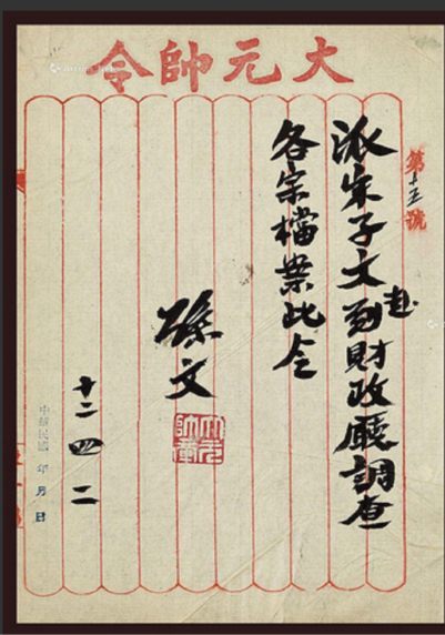 香港普藝拍賣行副主席莊志崗介紹說(shuō),這五封令文歷史價(jià)值極高,當(dāng)中以兩封“大元帥令”最為珍貴,用以委任,其中一封便寫(xiě)道:“任命宋子文為中央銀行副行長(zhǎng)”。