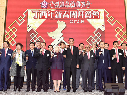 (香港之聲《新聞時空》)香港廣東社團總會昨天(20日)舉行丁酉年新春團拜餐會。香港特區(qū)行政長官梁振英、中央政府駐港聯(lián)絡(luò)辦副主任楊健等應(yīng)邀擔任主禮嘉賓,共賀新春。