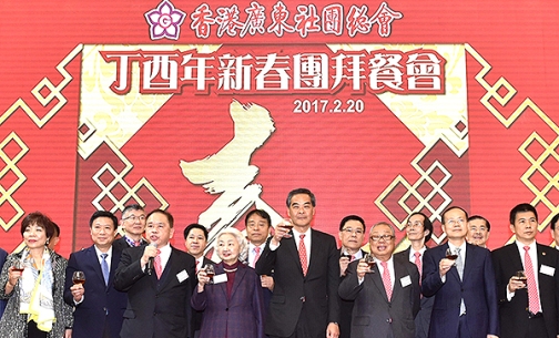 香港廣東社團總會日前舉行丁酉年新春團拜餐會。香港特別行政區(qū)行政長官梁振英、中央政府駐港聯(lián)絡(luò)辦副主任楊健等應(yīng)邀擔任主禮嘉賓,共賀新春。