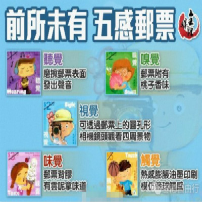 央廣網(wǎng)香港7月15日消息 香港郵政7月18日將推出一套以“人體五感官”為題的兒童特別郵票及相關(guān)集郵品,并首次為每一款郵票加入不同的印刷效果,表達(dá)聽覺、視覺、嗅覺、味覺及觸覺五種感覺。