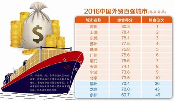 海關總署主管的《中國海關》雜志公布“2016中國外貿百強城市”名單。2016年,全國外貿百強名單中前10位的城市分別是:深圳、上海、東莞、蘇州、珠海、廣州、廈門、天津、寧波、北京。