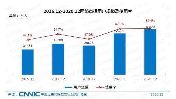 截至2020年12月,我國網(wǎng)絡(luò)直播用戶規(guī)模達6.17億,較2020年3月增長5703萬,占網(wǎng)民整體的62.4%。其中,電商直播用戶規(guī)模為3.88億,較2020年3月增長1.23億,占網(wǎng)民整體的39.2%。此外,真人秀直播和演唱會直播用戶數(shù)較2020年3月均有所增長,占比分別為24.2%和19.2%;游戲直播和體育直播用戶數(shù)較2020年3月均減少,占比分別為19.3%和13.9%。