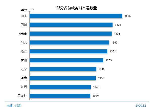 河南省各級政府共開通政務(wù)機構(gòu)微博10130個,居全國首位。開通政務(wù)頭條號最多的省份為山東省,共開通7874個;共10個省份開通的政務(wù)頭條號超過3000個。同時,山東也是開通政務(wù)抖音號數(shù)量最多的省份,共開通1586個。