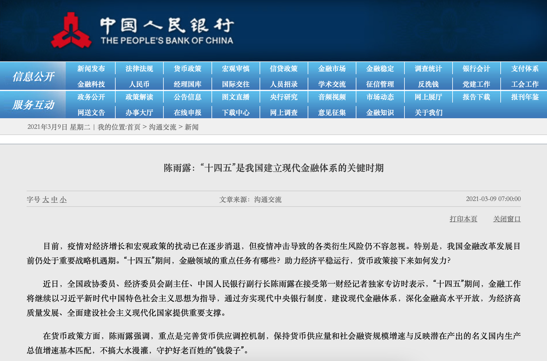 陳雨露:“十四五”是“兩個(gè)一百年”奮斗目標(biāo)的歷史交匯時(shí)期,也是我們建立現(xiàn)代金融體系的關(guān)鍵時(shí)期。人民銀行將認(rèn)真履行國(guó)務(wù)院金融委辦公室職責(zé),按照市場(chǎng)化、法治化、國(guó)際化原則,持續(xù)推動(dòng)建設(shè)現(xiàn)代金融體系,進(jìn)一步打通金融向?qū)嶓w經(jīng)濟(jì)的傳導(dǎo),更好支持國(guó)民經(jīng)濟(jì)重點(diǎn)領(lǐng)域和薄弱環(huán)節(jié),更好支持加快構(gòu)建雙循環(huán)新發(fā)展格局。