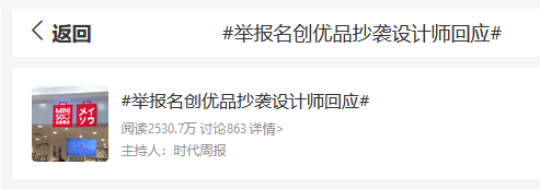 隨后,名創(chuàng)優(yōu)品被設(shè)計(jì)師舉報(bào)抄襲的消息迅速發(fā)酵,相關(guān)話題登上微博熱榜單。兩天內(nèi),#名創(chuàng)優(yōu)品被設(shè)計(jì)師舉報(bào)抄襲#的話題閱讀量超2.3億。當(dāng)日下午,名創(chuàng)優(yōu)品客服表示,已經(jīng)報(bào)備相關(guān)部門進(jìn)行核查。