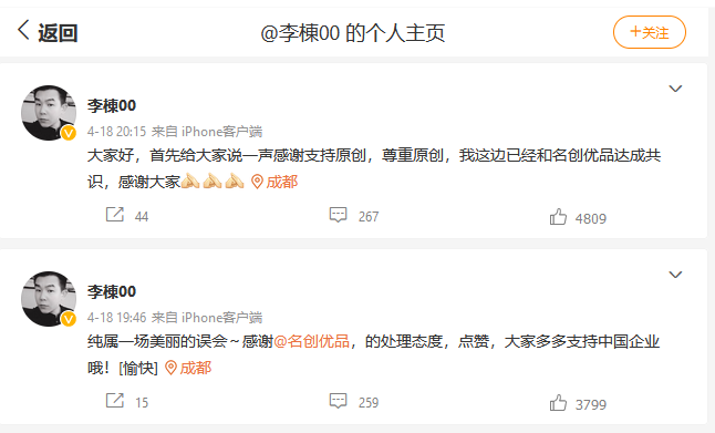 然而,很快,“戲劇化”的一幕出現(xiàn)了。18日晚間,設(shè)計(jì)師@李棟00 改口了。該名設(shè)計(jì)師連發(fā)兩條微博回應(yīng)稱,“純屬一場美麗的誤會(huì)”,還為名創(chuàng)優(yōu)品點(diǎn)贊,表示已和名創(chuàng)優(yōu)品達(dá)成共識(shí),并在接受媒體采訪時(shí)表示,將與名創(chuàng)優(yōu)品合作1-3年。