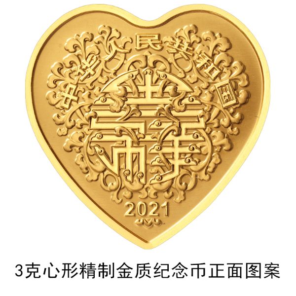 3克心形金質“琴瑟和鳴”紀念幣(5月20日發(fā)行)背面圖案為兩只小鳥、樹、果實等組合圖案,并刊“琴瑟和鳴”字樣及面額。