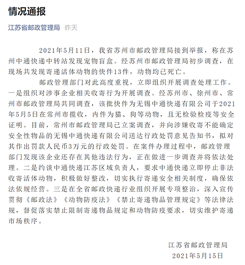 郵政管理部門對(duì)此高度重視,立即組織開展調(diào)查處理工作。一是組織對(duì)涉事企業(yè)相關(guān)收寄行為開展調(diào)查。經(jīng)蘇州市、徐州市、常州市郵政管理局共同調(diào)查,該批快件為無錫中通快遞有限公司于2021年5月5日在常州市攬收,內(nèi)件為貓、狗等動(dòng)物,且無檢驗(yàn)檢疫等安全證明。目前,常州市郵政管理局已立案調(diào)查,并向涉嫌收寄不能確定安全性物品的無錫中通快遞有限公司送達(dá)行政處罰意見告知書,擬對(duì)其作出罰款人民幣3萬元的行政處罰。在案件辦理過程中,郵政管理部門發(fā)現(xiàn)該企業(yè)還存在其他違法行為,正在做進(jìn)一步調(diào)查并將依法處理。二是約談中通快遞江蘇區(qū)域負(fù)責(zé)人,要求中通快遞立即停止非法收寄活體動(dòng)物,積極做好整改,切實(shí)執(zhí)行寄遞安全相關(guān)制度,確保依法依規(guī)經(jīng)營。三是在全省郵政快遞行業(yè)組織開展專項(xiàng)整治,深入宣傳貫徹《郵政法》《動(dòng)物防疫法》《禁止寄遞物品管理規(guī)定》等法律法規(guī),督促落實(shí)禁止限制寄遞物品規(guī)定和動(dòng)物防疫要求,切實(shí)維護(hù)寄遞市場(chǎng)秩序。