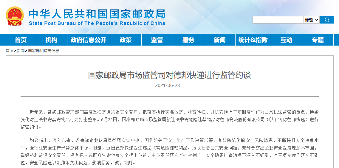 央廣網(wǎng)北京6月23日消息(記者 牛谷月)記者從國(guó)家郵政局官方獲悉,6月22日,國(guó)家郵政局市場(chǎng)監(jiān)管司就違法收寄危險(xiǎn)違禁物品對(duì)德邦物流股份有限公司(以下簡(jiǎn)稱德邦快遞)進(jìn)行監(jiān)管約談。