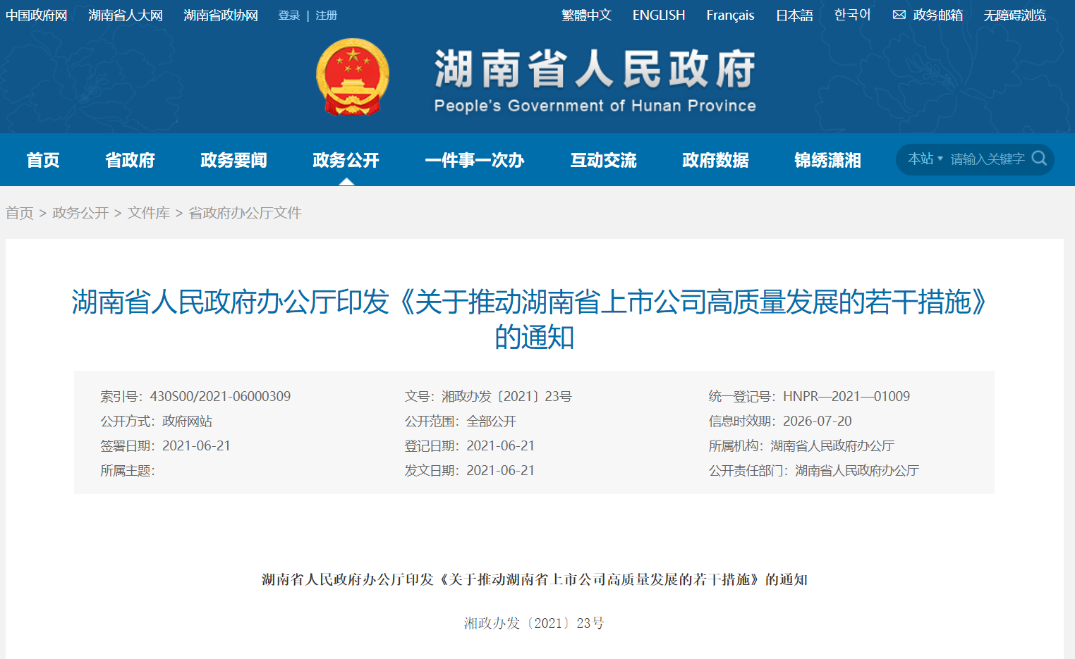 央廣網(wǎng)北京6月24日消息(記者 萬玉航)6月23日晚,記者從湖南省人民政府網(wǎng)站獲悉,《關于推動湖南省上市公司高質量發(fā)展的若干措施》(以下簡稱《措施》)已正式印發(fā)!洞胧访鞔_了發(fā)展目標:到“十四五”末,全省上市公司達200家以上,總市值超3萬億元,資產(chǎn)證券化率達50%以上。