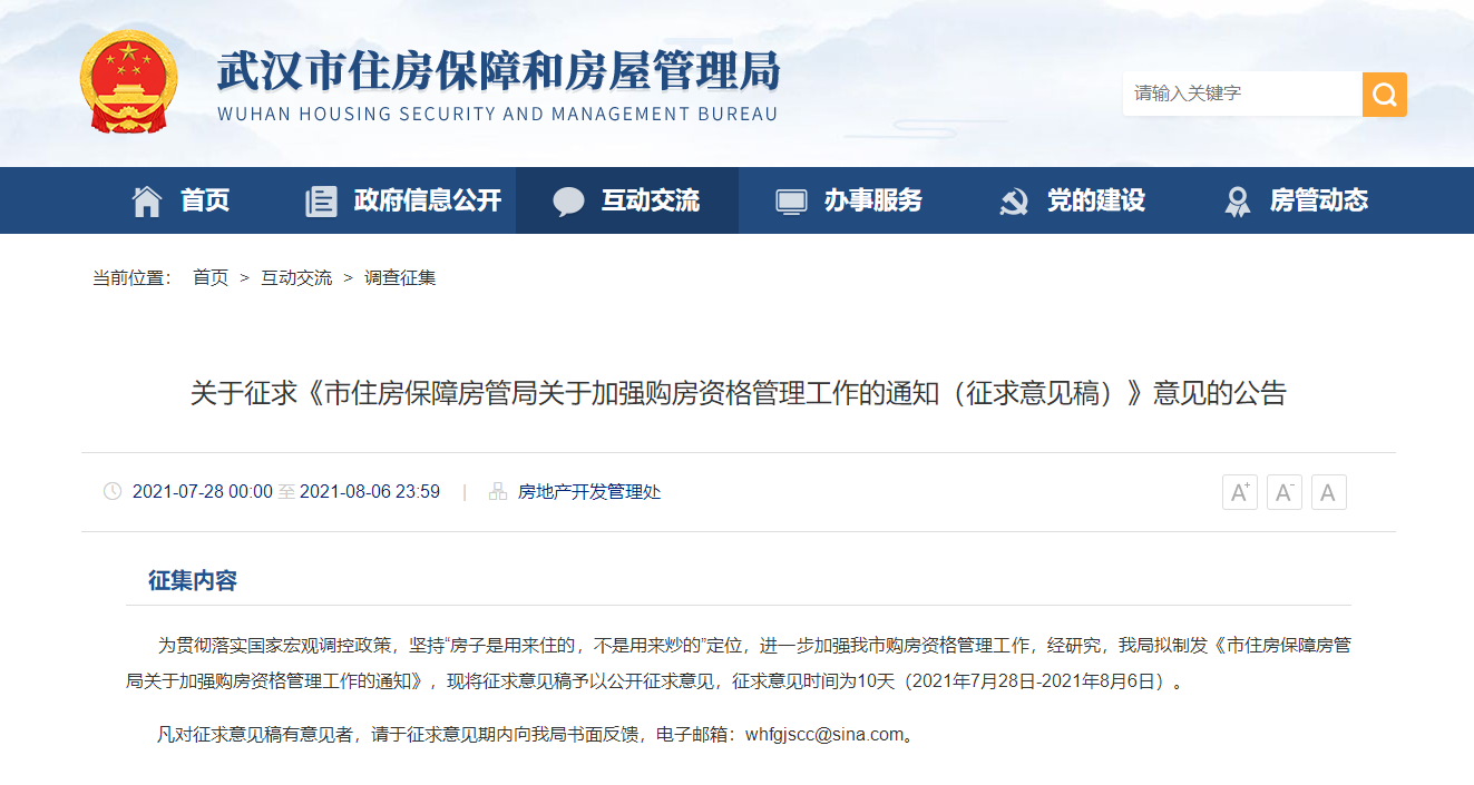 28日,武漢市住房保障和房屋管理局發(fā)布《武漢市住房保障房管局關(guān)于加強(qiáng)購(gòu)房資格管理工作的通知(征求意見(jiàn)稿)》(以下簡(jiǎn)稱“意見(jiàn)稿”),征求意見(jiàn)時(shí)間為10天(2021年7月28日-2021年8月6日)。