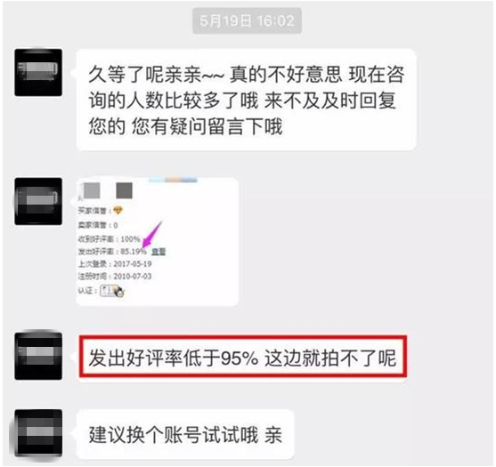 周小姐介紹,“她下單的時(shí)候,交易直接是關(guān)閉狀態(tài),直接沒法付款,下不了單。這是什么原因?客服明確跟她說,‘這是因?yàn)槟愫迷u(píng)率低于95%,所以不給下單!髞砦覀兞私獾,不少淘寶上做得比較大的店鋪,都有類似的做法。以前只是個(gè)例,最近集中爆發(fā)出來了!