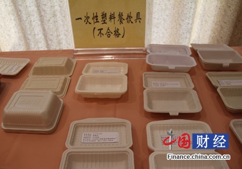 8月8日舉行的食品包裝產(chǎn)品質(zhì)量情況調(diào)查發(fā)布會(huì)上展示不合格快餐盒。中國(guó)網(wǎng)記者 姚毅婧 攝