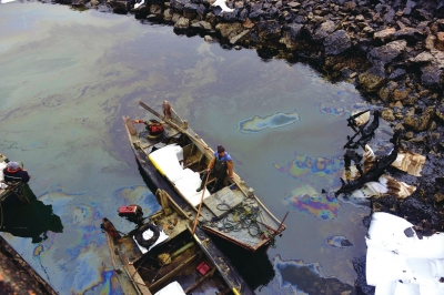 這時,我接到安全科長的一個電話說,海邊溢油現(xiàn)象嚴重。因此,我立即趕往海邊參加處置。到海邊大約8點40分,看見地方相關(guān)部門的人員也陸續(xù)前來,包括安監(jiān)、環(huán)保、海事和市政的人,穿著樣式不同的服裝。