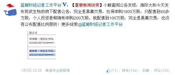 名字為@藍鯨財經(jīng)記者工作平臺的微博爆料稱,“海際大和今天發(fā)布我武生物的網(wǎng)下配售公告,完全是黑幕交易,社保申購1800萬股,只配售到60多萬股,個人投資者柳海彬申購200萬股,就配售到100萬股,完全是黑幕交易,也沒有公布配售比例原則!”
