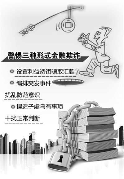 據(jù)介紹,目前金融詐騙活動(dòng)有三種常見(jiàn)方式:一是設(shè)置利益誘餌騙取匯款:典型的有詐騙分子采用電話或短信群發(fā)的方式,發(fā)布“活動(dòng)中獎(jiǎng)”、“低息無(wú)抵押小額貸款”、“稅費(fèi)退返”等消息,巧立名目要求受害者向詐騙分子指定的賬戶匯出“手續(xù)費(fèi)”、“公證費(fèi)”、“郵寄費(fèi)”、“稅費(fèi)返點(diǎn)”等款項(xiàng);二是編排突發(fā)事件擾亂防范意識(shí):典型的有冒充銀行業(yè)金融機(jī)構(gòu)官方信息平臺(tái),發(fā)布“銀行卡異地巨額消費(fèi)”短信,冒充親朋好友在異地急需資金救急等,誘騙群眾匯出資金;三是捏造子虛烏有事項(xiàng)干擾正常判斷:典型的有謊稱“賬戶涉嫌洗錢犯罪”、“個(gè)人信息遭泄、銀行賬戶不安全”、“郵寄的物品中藏有毒品”等,要求消費(fèi)者直接將賬戶資金轉(zhuǎn)入所謂的“公共安全部門(mén)設(shè)立的安全賬戶”以“保障資金安全”,或冒充公、檢、法工作人員套取消費(fèi)者的賬戶名稱和交易密碼。
