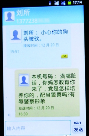 帖子中還附有一張手機短信對話的照片,照片顯示,該手機在12月20日15點51分收到一條來自通訊錄名字為“劉所”的短信:“小心你的狗頭被砍!50分鐘后,該手機回復(fù):“滿嘴臟話,你媽怎教育你來了,黨是怎樣培養(yǎng)你的,配當警察嗎?有辱警察形象!
