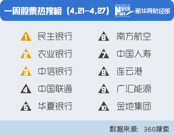 360搜索數(shù)據(jù)顯示,截至2014年4月27日,入選一周股票熱搜榜前10位的上市公司依次為:民生銀行、農(nóng)業(yè)銀行、中信銀行、中國聯(lián)通、華夏銀行、南方航空、中國人壽、連云港、廣匯能源和金地集團。