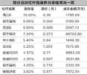 不僅上述三只,活躍品種中,銀華銳進(jìn)、中小板B、證券B等漲幅也超過5%,這幾只杠桿指基跟蹤的指數(shù)既有中小板、深證100,也有申萬證券行業(yè)指數(shù)。剔除少數(shù)成交不活躍的品種,杠桿指基昨日全部普漲。