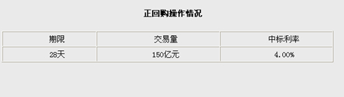 據(jù)中國人民銀行網(wǎng)站消息,人民銀行于本周二(7月29日)以利率招標(biāo)方式規(guī)模為150億元的正回購操作。此次正回購中標(biāo)利率4.00%,期限28天。