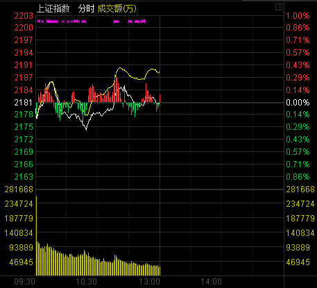 新華網(wǎng)消息 今日兩市小幅低開后維持調(diào)整態(tài)勢,早盤滬指在2180點(diǎn)位處徘徊震蕩,深成指數(shù)表現(xiàn)略優(yōu)于滬指,創(chuàng)業(yè)板早盤下探后回升,成V字形態(tài)。截止午盤,滬指報(bào)2181.11點(diǎn),下跌0.13點(diǎn),跌幅0.01%,成交689.7億元;深成指報(bào)7877.77點(diǎn),上漲24.54點(diǎn),漲幅0.31%,成交818.5億元;創(chuàng)業(yè)板指報(bào)1345.00點(diǎn),上漲2.26點(diǎn),漲幅0.17%,成交133.4億元。