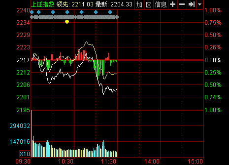 新華網(wǎng)消息 今日兩市微幅低開,指數(shù)一度沖高回落,10點46分指數(shù)在金融、地產(chǎn)、煤炭、有色權(quán)重股集體下挫帶動下出現(xiàn)滑梯行情,滬指受壓2200點。創(chuàng)業(yè)板方面,小幅低開后震蕩拉升,截至午盤小幅上漲。成交量方面兩市較前一交易日半日成交量均有所放量。截至午盤,滬指報2204.33點,下跌0.56點,跌幅0.59%,成交753.26億元;深成指報7950.33點,下跌45.17點,跌幅0.56%,成交858.75億元;創(chuàng)業(yè)板指報1372.06點,上漲6.32點,漲幅0.46%,成交149.73億元。