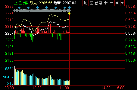 新華網(wǎng)消息 27日滬深兩市早盤維持震蕩。滬指在2210點(diǎn)縮量盤整,深成指小幅上揚(yáng),技術(shù)上站穩(wěn)30日均線;創(chuàng)業(yè)板高開(kāi)高走一度漲逾1%。截至午盤,滬指報(bào)2212.12點(diǎn),上漲5.01點(diǎn),漲幅0.23%,成交600.87億元;深成指報(bào)7869.99點(diǎn),上漲56.01點(diǎn),漲幅0.72%,成交762.83億元;創(chuàng)業(yè)板指報(bào)1424.22點(diǎn),上漲13.07點(diǎn),漲幅0.93%,成交141.73億元。