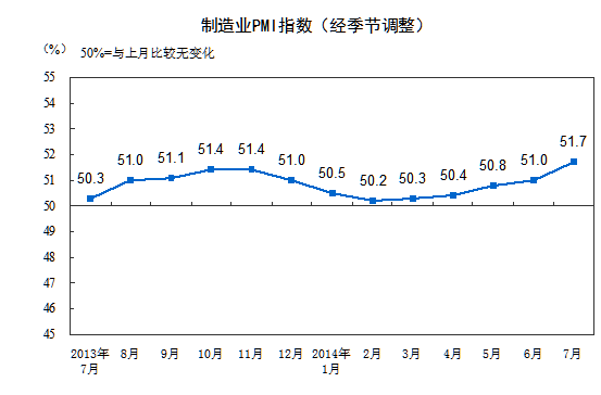 2014年7月,中國制造業(yè)采購經(jīng)理指數(shù)(PMI)為51.7%,比上月上升0.7個(gè)百分點(diǎn),連續(xù)5個(gè)月回升,表明我國制造業(yè)穩(wěn)中向好的趨勢更加明顯。