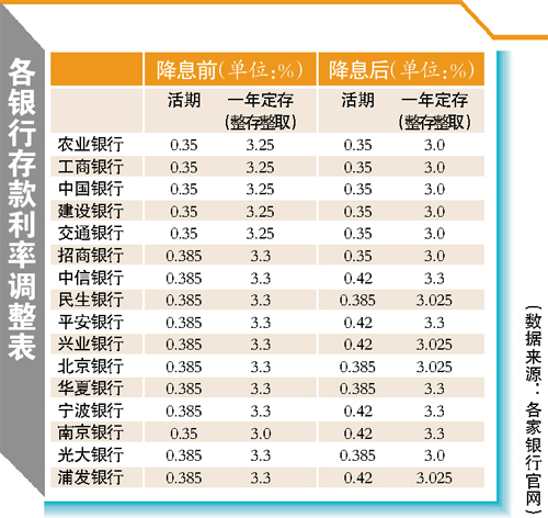 定存方面,降息前,招商銀行、光大銀行一年期定存利率為3.3%,存100萬定期一年能獲得利息33000元,而降息后這兩家銀行的定存利率降到了3%,一年利息減少3000元。而降息前南京銀行一年定存的利率為3%,一年能獲得30000元利息,降息后南京銀行一年定存利率反升到了3.3%,一年利息增加3000元。