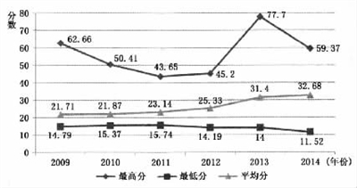 歷年省級財政透明度得分的最高分、最低分和平均分