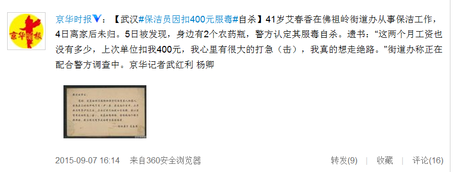 保潔員工資被扣400服毒自殺 留遺書稱很受打擊(圖)