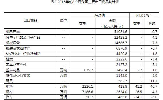 五、機電產(chǎn)品出口增長,傳統(tǒng)勞動密集型產(chǎn)品有所下降。前8個月,我國機電產(chǎn)品出口5.11萬億元,增長0.7%,占出口總值的57%。其中,電器及電子產(chǎn)品出口2.24萬億元,增長4.1%;機械設(shè)備1.47萬億元,下降7.3%。同期,服裝出口6876.9億元,下降6.7%;紡織品4420.8億元,下降1.8%;鞋類2222.6億元,下降3.4%;家具2127.2億元,增長5.1%;塑料制品1496.4億元,增長1.8%;箱包1142億元,增長5.9%;玩具582.7億元,增長11.1%;上述7大類勞動密集型產(chǎn)品合計出口1.89萬億元,下降2.1%,占出口總值的21.1%。此外,肥料出口2226.1萬噸,增加41.2%;鋼材7186.6萬噸,增加26.5%;汽車50.2萬輛,減少14.1%(表2)。