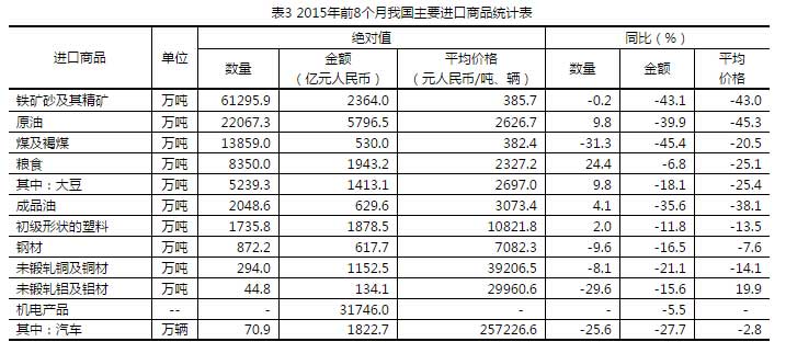 六、原油、糧食、成品油等主要大宗商品進口量增加,主要進口商品價格普遍下跌。前8個月,我國進口鐵礦砂6.13億噸,微降0.2%,進口均價為每噸385.7元,下跌43%;原油2.21億噸,增加9.8%,進口均價為每噸2626.7元,下跌45.3%;煤1.39億噸,減少31.3%,進口均價為每噸382.4元,下跌20.5%;成品油2048.6萬噸,增加4.1%,進口均價為每噸3073.4元,下跌38.1%;初級形狀的塑料1735.8萬噸,增加2%,進口均價為每噸1.08萬元,下跌13.5%;鋼材872.2萬噸,減少9.6%,進口均價為每噸7082.3元,下跌7.6%;未鍛軋銅及銅材294萬噸,減少8.1%,進口均價為每噸3.92萬元,下跌14.1%。