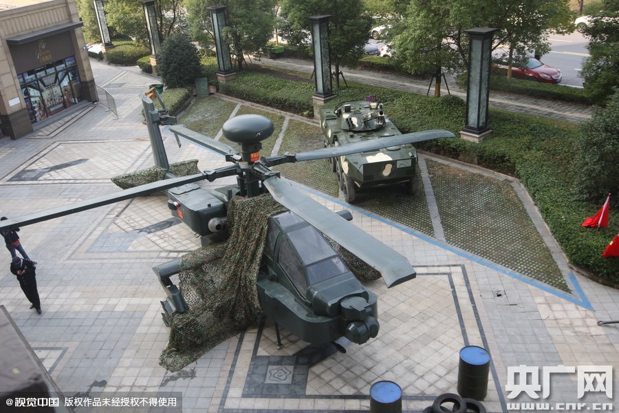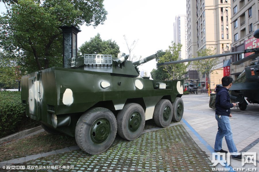 2015年11月02日,浙江杭州,杭州一家房產(chǎn)商為了沖量,用上了“飛機(jī)大炮坦克”。該開(kāi)發(fā)商在樓盤外放置了三架仿真模型飛機(jī),一架艦載機(jī),兩架直升級(jí),另有兩門“大炮”、兩輛“裝甲車”、一輛“坦克”。這些大家伙因?yàn)橥庑伪普妫耸忻竦难矍颉?月至10月一向是一年成交旺季,自進(jìn)入金九銀十以來(lái),杭州各城區(qū)成交量有一定程度的上升,但因?yàn)閹?kù)存較大,銷售前景并不樂(lè)觀。