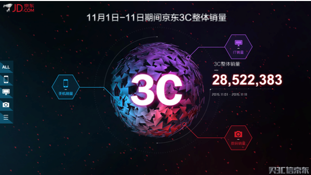 2015年11月12日,京東雙11大促收官。自11月1日至11日24點(diǎn),京東3C品類總銷量為28,522,383臺(tái)。其中,京東手機(jī)總銷量達(dá)2,874,031臺(tái),電腦辦公品類總銷量達(dá)14,335,143臺(tái)、數(shù)碼品類總銷量達(dá)11,313,209臺(tái)。