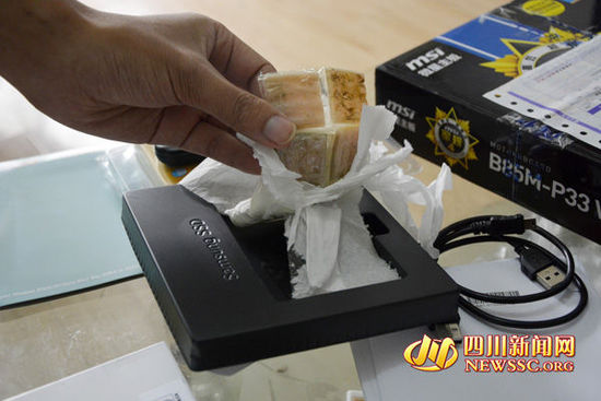 今日中午,四川新聞網(wǎng)記者在趙宇家里看到,他所收到的5塊石頭為邊長(zhǎng)2厘米左右的正方形小瓷磚,用透明膠帶粘在一起,裹上紙巾正好能夠填充在本應(yīng)裝放硬盤的長(zhǎng)方形凹槽內(nèi)。