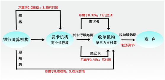 收單服務費由收單機構向商戶收取,費改后不設定具體數(shù)額,由兩者協(xié)商決定。發(fā)卡行服務費由發(fā)卡機構向收單機構收取,分為借記卡和貸記卡兩套標準執(zhí)行:前者費率水平不超過0.35%,單筆收費金額不超過13元;后者費率水平不超過0.45%,不實行單筆封頂控制。網(wǎng)絡服務費由銀行清算機構向發(fā)卡機構和收單機構收取,不超過交易金額的0.065%,單筆交易的收費金額不超過6.5元;由發(fā)卡、收單機構各承擔50%。